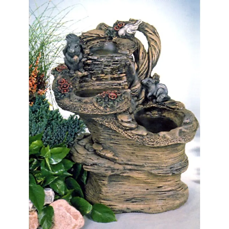 Une charmante petite fontaine qui ressemble à un vieux tronc d'arbre avec des écureuils et des oiseaux qui courent. Cette fontaine est parfaite pour les intérieurs en raison de sa petite taille et de son caractère sans entretien.