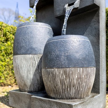 Son design bicolore apporte élégance et modernité au jardin. Les jardinières intégrées permettent d’ajouter des plantes décoratives. L’éclairage LED valorise la cascade le soir. Construction robuste en polyresin résistante aux intempéries. Installation simple via alimentation secteur.