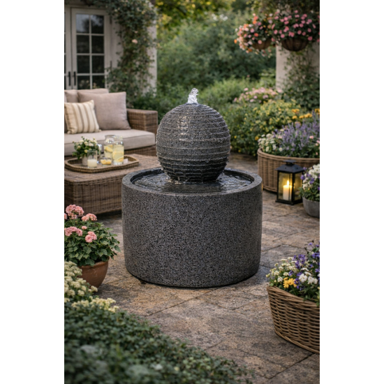 La sphère contemporaine à surface étagée permet à l’eau de s’écouler délicatement en créant un effet lumineux naturel.