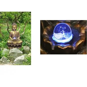La fontaine d'image de Bouddha dorée inhabituelle et antique sera un excellent ajout à votre jardin, orangerie ou autres lieux, à l'intérieur ou à l'extérieur. Il a une boule de cristal qui semble flotter doucement au-dessus de l'eau, projetant une lueur magique lorsque la LED illumine la fontaine. L'eau s'écoule lentement de la fleur de lotus à travers les mains du Bouddha et s'écoule dans le réservoir en dessous.