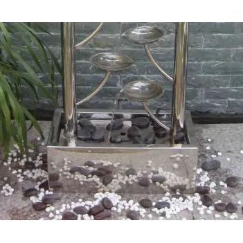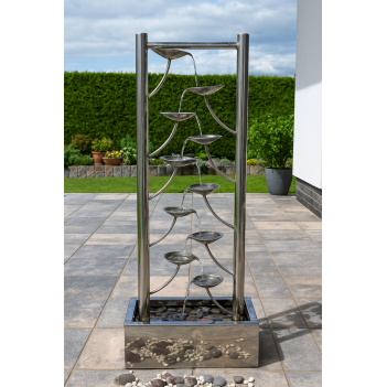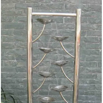 Il a un cadre en acier solide et se compose de dix plaques placées sur des poteaux courbes. L'eau coule sur chacun d'eux, créant un spectacle magnifique et une aura de paix. De plus, la fontaine est éclairée par la bande lumineuse LED située dans la base du produit, lui conférant un charme magique.
