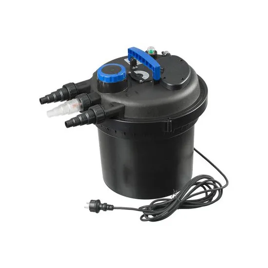 Les filtres BioPressure sont disponibles en quatre puissances différentes, à la fois sous forme de kits de base contenant uniquement le filtre et sous forme de kits plus avec une pompe attachée. Le filtre BioPressure peut être utilisé dans des bassins jusqu'à 6 000 litres (sans poissons) ou 3 000 litres (avec poissons). Comme son nom l'indique, l'eau s'écoule à travers la BioPressure sous pression. Cela signifie qu'il est possible de pomper l'eau à un niveau supérieur, par exemple dans une cascade ou un ruisseau, mais aussi que le filtre ne débordera pas ou ne se cassera pas lorsqu'il est installé à un niveau inférieur ou même en dessous du niveau de l'eau.
