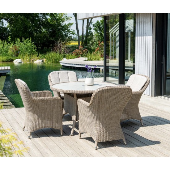 La Hazelmere Round Table 1.15m est une table ronde d’extérieur élégante. What’s included : 1 table Hazelmere de 115 cm de largeur × 115 cm de profondeur × 74 cm de hauteur, poids env. 17 kg. Conçue pour environ 4 personnes et dotée d’un plateau en verre effet céramique avec structure tressée résistante. Garantie : 3 ans.