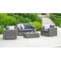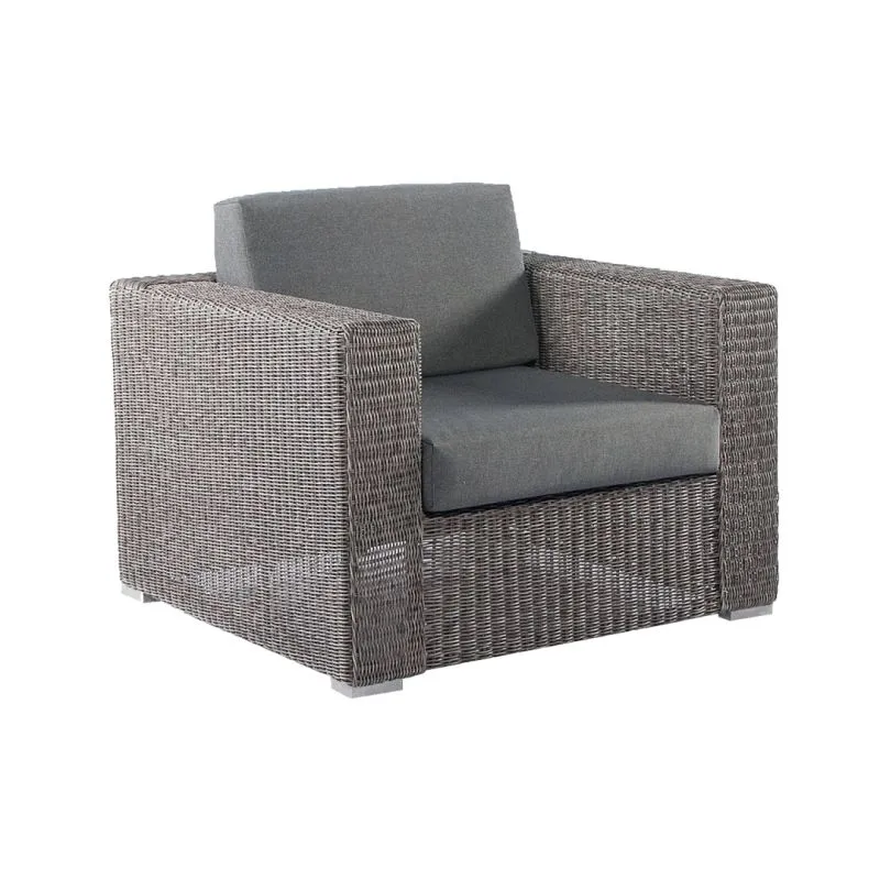 Monte Carlo est une collection de meubles produits dans une usine de Cebu. Le rotin synthétique texturé de 3 mm donne une sensation naturelle, tandis que les coussins rembourrés gris foncé complètent le tissage gris.