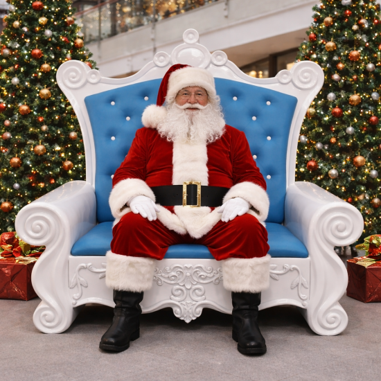 Santa Sofa (Blue/White) fait partie d’une gamme de trônes et sièges décoratifs de Noël fabriqués en résine fibre de verre durable et conçus pour des installations festives professionnelles.