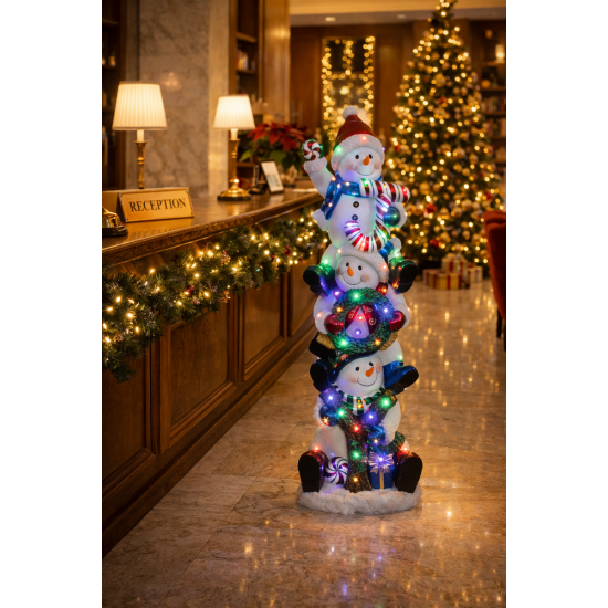 Stacked Joy Snowmen (45 LEDS) fait partie d’une collection de décorations de bonshommes de neige fabriquées en résine fibre de verre résistante aux intempéries et en métal durable, adaptées aux installations festives professionnelles.