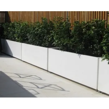 Górna krawędź tych sadzarek jest dwukrotnie odwrócona, co nadaje im wspaniały ponadczasowy wygląd. Sadzarki są produkowane z wysokiej jakości wzmocnionego włókna szklanego. Ponieważ zbrojenie zostało rozszerzone na rogi, rogi te nie mogą się rozerwać. Sadzarka jest barwiona cała i dlatego zachowa swój kolor. Standardowo wszystkie błyszczące donice z włókna szklanego są dostarczane w kolorze RAL 9016.