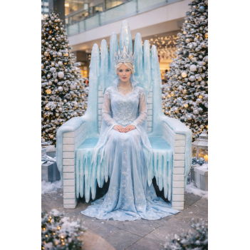 Powierzchnia tronu została zaprojektowana tak, aby przypominać bryły lodu osadzone na białej ceglanej strukturze, co nadaje mu wyjątkowo realistyczny i elegancki charakter. Produkt jest przeznaczony jako siedzisko oraz dekoracja do sesji zdjęciowych, dlatego doskonale sprawdzi się w galeriach handlowych, ogrodach zimowych, hotelach, parkach rozrywki czy podczas wydarzeń świątecznych.