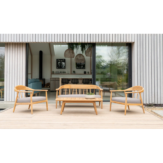 Drewno tekowe z czasem uzyskuje naturalną srebrno-szarą patynę, a poduszki z wysokiej jakości tkaniny Agora są odporne na blaknięcie i lekką wilgoć. Pokrowce do poduszek w zestawie; zalecane przechowywanie poduszek poza sezonem zimowym. 10 lat gwarancji.