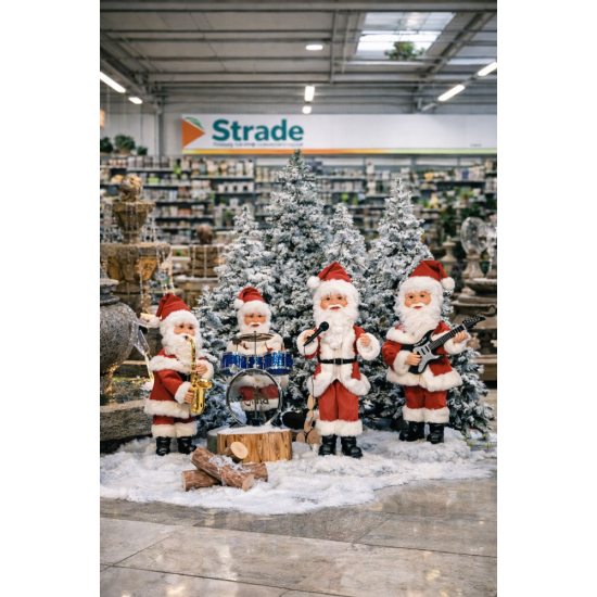 Animatroniczna scena Santa Band (4 figures) została zaprojektowana jako efektowny i interaktywny element profesjonalnych aranżacji bożonarodzeniowych. Czterech Świętych Mikołajów tworzy muzyczny zespół, który porusza się synchronicznie do odtwarzanej muzyki, reagując na dźwięk i nadając całej scenie realistyczny, żywy charakter. Dzięki sterowaniu dźwiękiem ekspozycja przyciąga uwagę odbiorców i zwiększa ich zaangażowanie w przestrzeni handlowej lub wystawowej.