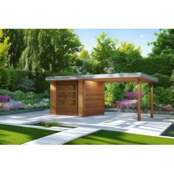 Wejście do wnętrza prowadzi przez szerokie, dwuskrzydłowe drzwi wyposażone w trzy przeszklone panele na każdym skrzydle, które wypełniają przestrzeń naturalnym światłem. Bezpieczeństwo zapewnia wbudowany zamek bębenkowy. Domek dostępny jest w wersji naturalnej, co umożliwia dopasowanie go do indywidualnych preferencji. Opcjonalnie można wyposażyć go w przedłużenie dachu o szerokości 2 lub 3 metrów, które zwiększa funkcjonalność i przestrzeń użytkową.