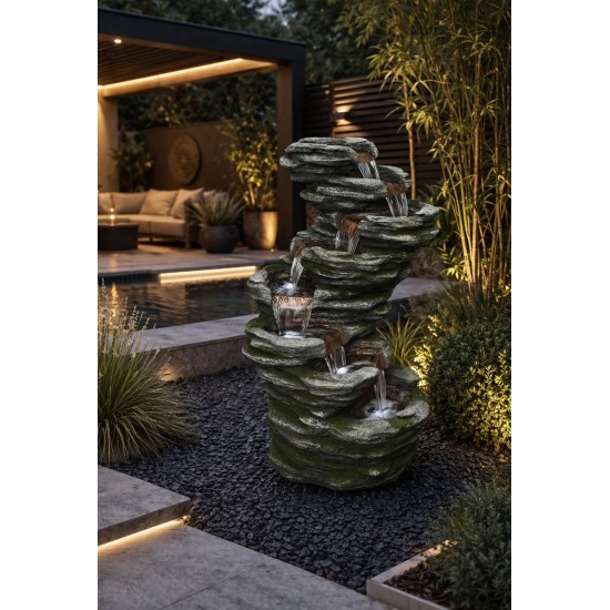 Fontanna ogrodowa 7 Fall Slate to efektowna dekoracja z realistycznym wykończeniem łupka, która tworzy relaksującą atmosferę dzięki kaskadowemu przepływowi wody i podświetleniu LED. Model jest w pełni samowystarczalny, łatwy w montażu i przeznaczony do użytku zewnętrznego. Solidna konstrukcja z żywicy zapewnia odporność na warunki atmosferyczne. Wymiary produktu: L 58 x W 47 x H 104 cm, waga 23 kg. Idealna jako centralny element ogrodu lub tarasu.