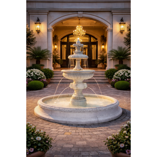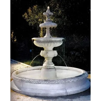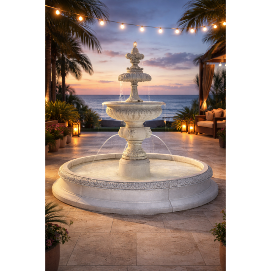 Woda spływa środkiem i bokiem do misy lub basenu poniżej. Jedna z większych fontann, z wieloma źródłami odprowadzania wody, która powoduje głośny odgłos spadającej wody. Reprezentatywny produkt wykorzystywany jako punkt centralny dla większych zakładów usługowych/produkcyjnych. W połączeniu z oświetleniem halogenowym daje elektryzujący efekt wizualny, przyciągając uwagę z dużej odległości. Produkt doskonale nadaje się do oczka wodnego, można go również postawić na suchej powierzchni. Klasyczna forma fontanny doskonale sprawdzi się w każdym ogrodzie, parku, restauracji czy rezydencji.