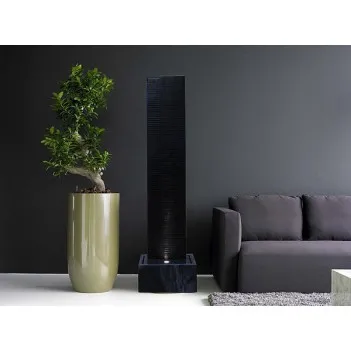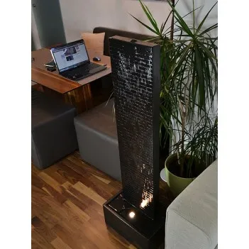 Ściana z kamienia naturalnego wykonana w Austrii ze skandynawskiego granitu Nero wywołuje emocje i emanuje radością życia. Zamknij oczy, słuchaj kojącego dźwięku wody i wdychaj zdrowe powietrze w pomieszczeniu. Odpręż się i odpocznij po męczącym dniu. Wszystko to daje ta ściana wody. Ściany wodne są idealne do poprawy jakości powietrza w pomieszczeniach w biurach i gabinetach, ponieważ wiążą cząsteczki brudu, jonizują powietrze i odparowują wystarczająco duże ilości wody. Zwiększa to koncentrację i skutecznie zapobiega wysychaniu skóry i błon śluzowych. Ten ręcznie robiony obiekt wodny jest oferowany w 3 rozmiarach o wysokości od 120 do 160 cm. Kompaktowe wymiary studni z kamienia naturalnego umożliwiają łatwy montaż w dowolnym miejscu. Woda przepływa przez cały pkorpus, dzięki czemu ta studnia ozdobna może być skutecznie wykorzystywana jako nawilżacz. Oświetlenie jest zmienne i można je włączyć lub wyłączyć w dowolnym momencie, nawet gdy woda płynie. Absolutny i ponadczasowy projekt obiektu wodnego pasuje do nowoczesnej atmosfery życia. Obiekt wodny może być jako elegancki dodatek do wyposażenia salonu i wellness @home.