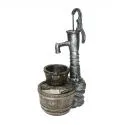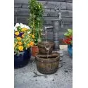 Rustykalne dekoracyjna pompa oraz zestaw beczek do ogrodu lub tarasu. Woda jest dostarczana za pomocą pompy i spływa do beczek, aby zakończyć we własnym zbiorniku wodnym.
