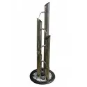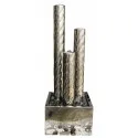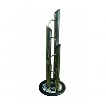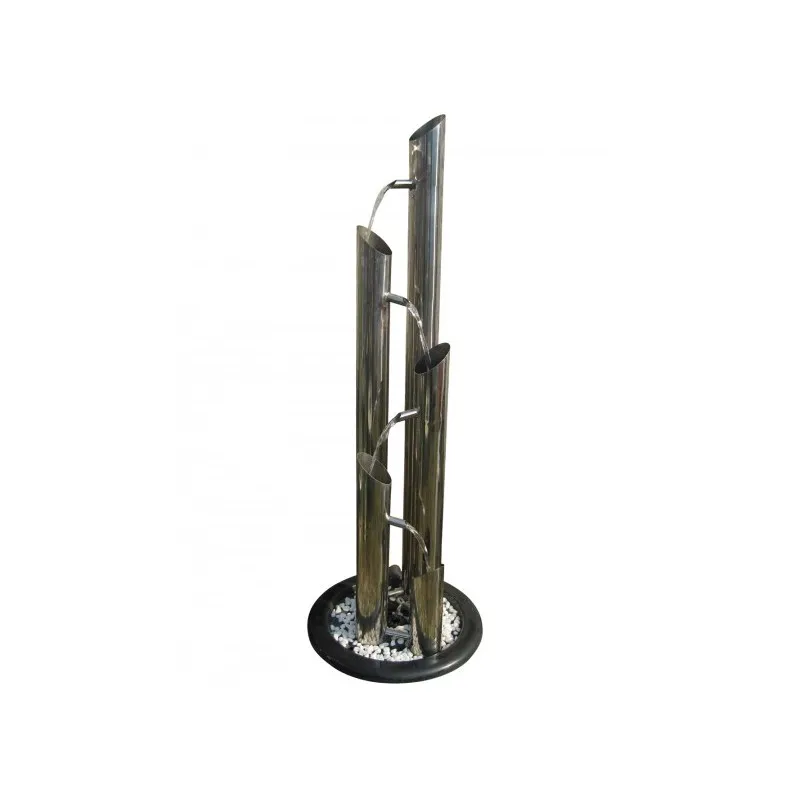Ciekawa i czarująca fontanna z wodą przepływającą rurami ze stali nierdzewnej do zbiornika poniżej.