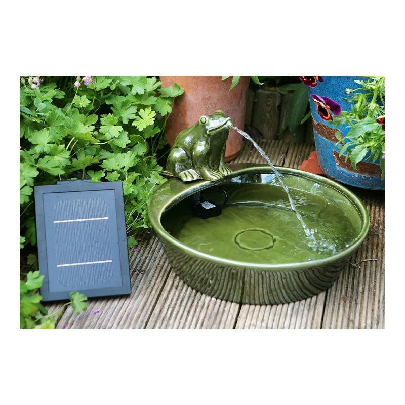Ceramiczna Funkcja Żaba Solar Woda jest w pełni autonomiczna, co oznacza, że nie jest wymagana żadna dodatkowa zapora. Jest także łatwa w instalacji - podłączyć pompę do panelu słonecznego, ustawić w miejsce bezpośredniego działania promieni słonecznych i napełnić wodą. Zarówno żaba i miski wykonane są z ceramiki glazurowanej i są wysokiej jakości dekoracyjnym elementem, który przyciągnie uwagę gdziekolwiek bedzie umieszczone.