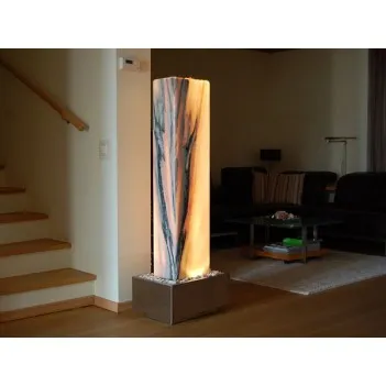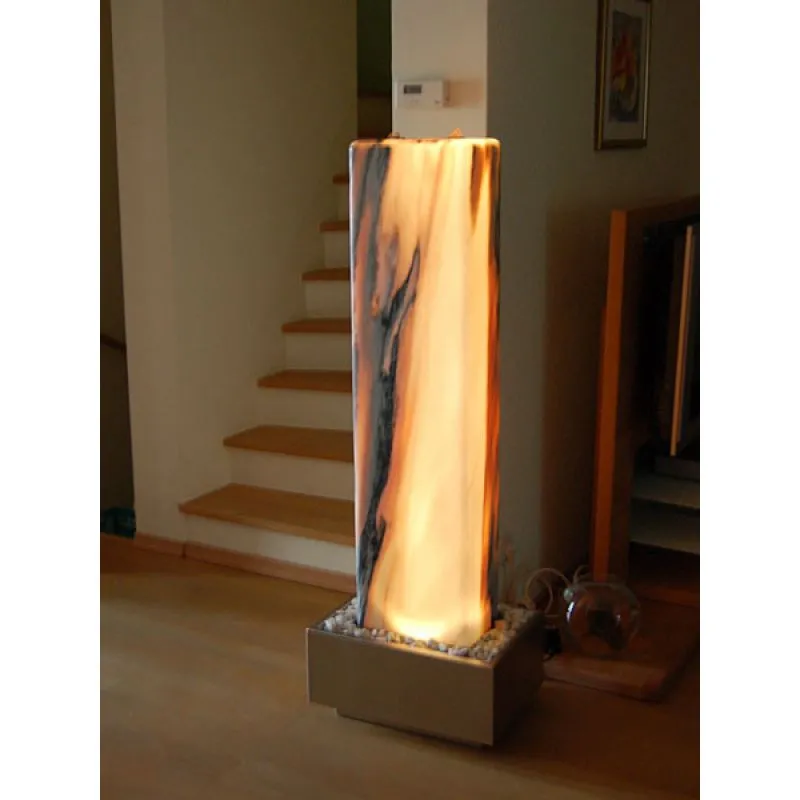 Prostokątny zbiornik wodny wykonany jest z marmurowych płyt Sölker o grubości 1 cm. Ta technika przetwarzania pozwala oświetlić ciało od wewnątrz i utrzymać niską wagę. Woda jest przenoszona za pomocą cichej, izolowanej pompy i przez dwie rurki ze stali nierdzewnej, pompować do góry, a następnie spuścić prawie bezgłośnie ze wszystkich czterech stron. Jakość oświetlenia podwodnego Oase gwarantuje ekonomiczną i bezpieczną obsługę, a także równomierne doświetlenie. Szczotkowana stal nierdzewna Nirosocket wizualnie poprawia jasny zbiornik wodny, działając jednocześnie jako zbiornik wody. Duża wystarczająca objętość napełnienia wynosząca 25 litrów umożliwia pracę bez konieczności uzupełniania codziennej wody.