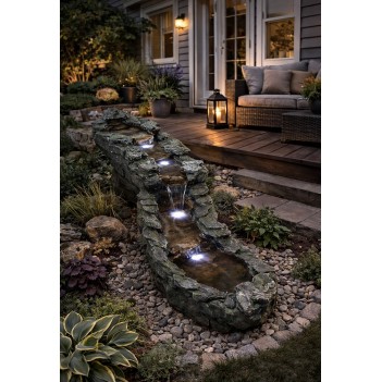 Średnia fontanna ogrodowa Slate River to elegancki element dekoracyjny, który wprowadza do ogrodu naturalny efekt płynącej rzeki. Dzięki realistycznemu wykończeniu imitującemu łupek oraz subtelnemu oświetleniu LED tworzy wyjątkową atmosferę zarówno w dzień, jak i po zmroku. Produkt o wymiarach L 192 x W 57 x H 50 cm i wadze 26 kg został zaprojektowany z myślą o użytkowaniu zewnętrznym. Zasilanie sieciowe zapewnia stabilną pracę, a trwały materiał żywiczny gwarantuje odporność na warunki atmosferyczne.