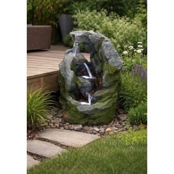 Tranwell Rock Falls to kompaktowa fontanna ogrodowa inspirowana naturalnymi skałami, idealna na taras, patio lub do ogrodu. Woda delikatnie spływa po strukturze przypominającej skałę, tworząc relaksujący efekt wizualny i dźwiękowy. Model wyposażony jest w oświetlenie LED, które podkreśla efekt wodospadu po zmroku. Dzięki samowystarczalnemu systemowi nie wymaga podłączenia do instalacji wodnej. Wymiary: L 36 x W 31 x H 55 cm.