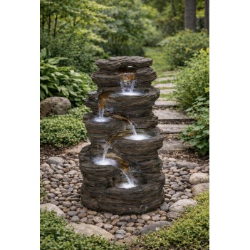Fontanna ogrodowa Northampton Slate Multifalls to doskonałe rozwiązanie dla osób poszukujących eleganckiej dekoracji wodnej do przestrzeni zewnętrznych. Projekt inspirowany naturalnym łupkiem nadaje jej realistyczny wygląd skał, a wielopoziomowy układ kaskad tworzy dynamiczny i relaksujący efekt przepływu wody. Dzięki zastosowaniu wysokiej jakości żywicy konstrukcja jest lekka, a jednocześnie bardzo trwała i odporna na działanie czynników atmosferycznych.