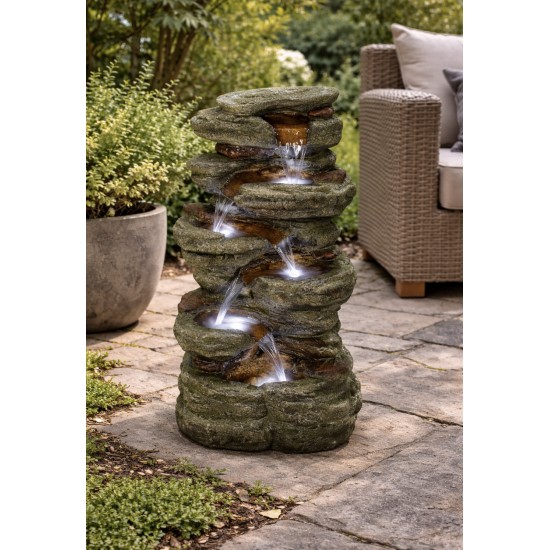 Fontanna ogrodowa Wellington Rock Falls to wyjątkowy element dekoracyjny przeznaczony do użytku zewnętrznego. Realistyczna konstrukcja inspirowana naturalnymi skałami oraz efekt kaskadowo spływającej wody tworzą relaksującą atmosferę w ogrodzie, na tarasie lub patio. Wbudowane oświetlenie LED podkreśla ruch wody po zmroku, tworząc elegancki efekt wizualny. Model wykonany jest z trwałej żywicy odpornej na warunki atmosferyczne. Wymiary produktu: L 39 x W 29 x H 78 cm, co czyni go idealnym rozwiązaniem zarówno do mniejszych, jak i większych przestrzeni ogrodowych.