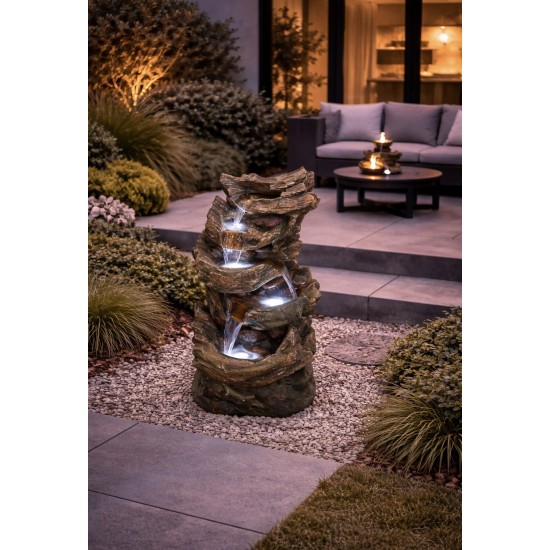 Zintegrowany system LED efektownie podświetla spływającą wodę, tworząc wyjątkowy klimat zarówno w dzień, jak i w nocy. Fontanna działa na zasilanie sieciowe, co zapewnia stałą wydajność i brak konieczności ładowania. To idealny wybór dla miłośników stylu woodland oraz naturalnych aranżacji ogrodowych. Produkt sprawdzi się zarówno w przestrzeniach prywatnych, jak i komercyjnych, takich jak hotele czy restauracje.