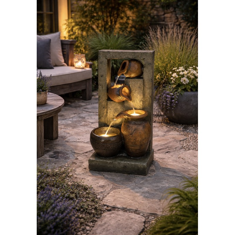 Vilamoura Pouring Pots to jedna z wielu fontann wodnych wykonanych z odpornej na warunki atmosferyczne żywicy oraz trwałych materiałów konstrukcyjnych.