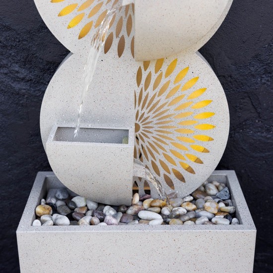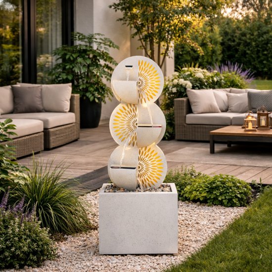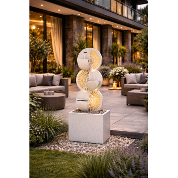 Wycięty wzór wachlarza nadaje fontannie charakterystyczny wygląd, który harmonijnie łączy się z nowoczesną i klasyczną architekturą ogrodową. Podświetlenie LED wydobywa detale konstrukcji i podkreśla ruch wody po zmroku. Neutralna kolorystyka sprawia, że produkt doskonale komponuje się z drewnem, kamieniem oraz roślinnością.