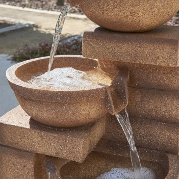 Fontanna Kendal z efektem ciepłego granitu to elegancka, trójpoziomowa dekoracja wodna do ogrodu i na taras. Woda wypływa do górnej misy i kaskadowo spływa do kolejnych poziomów, tworząc kojący dźwięk. Model ma wymiary 86 × 39 × 39 cm i jest wykonany z trwałej polirezyny. Wbudowane oświetlenie LED (cool white) podkreśla strumień wody po zmroku. Zasilanie sieciowe oraz wbudowany zbiornik i pompa zapewniają łatwy montaż bez instalacji wodnej.