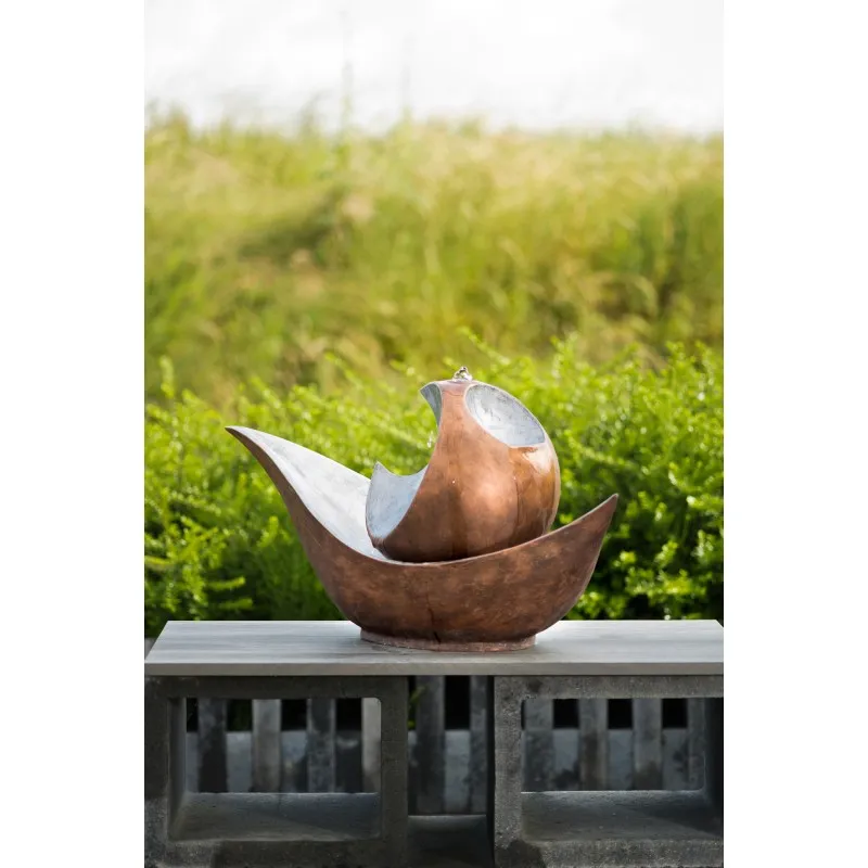 Nadzwyczajna fontanna o abstrakcyjnym kształcie, przekonuje do siebie również ze względu na bardzo nowoczesną kolorystykę miedzi i srebra. Dzięki oświetleniu LED tworzy fantastyczne efekty świetlne. Jest to kompletny zestaw wraz z pompą, po wypakowaniu gotowy od razu do pracy.