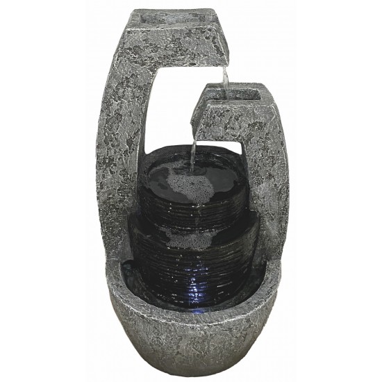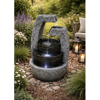Fontanna została wykonana z trwałej żywicy imitującej kamień, dzięki czemu jest lekka, a jednocześnie odporna na warunki atmosferyczne. Materiał ten zapewnia długą trwałość oraz estetyczny wygląd przez wiele sezonów. Dzięki zasilaniu solarnemu nie wymaga podłączenia do instalacji elektrycznej, co znacznie ułatwia montaż i pozwala ustawić fontannę w dowolnym miejscu ogrodu.
