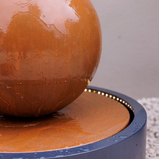 Fontanna ogrodowa Melincourt (wysokość 54 cm × szerokość 60 cm × głębokość 60 cm) to elegancka dekoracja w formie kuli wykonanej z ocynkowanego cynku w kolorze rust. Nowoczesny, minimalistyczny design doskonale sprawdzi się w ogrodzie, na tarasie lub balkonie. Wbudowane oświetlenie LED w ciepłej barwie podkreśla delikatny przepływ wody również po zmroku. System jest w pełni samowystarczalny – posiada zbiornik i pompę 650 LPH, zasilanie sieciowe umożliwia szybkie uruchomienie.