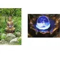 Niezwykła, antyczna, złota fontanna obrazująca Buddę, będzie wspaniałym dodatkiem do ogrodu, oranżerii lub innych miejsc, wewnątrz lub na zewnątrz. Posiada kryształową kulę, która wydaje się jakby unosić delikatnie nad wodą, rzucając magiczną poświatę, gdy dioda LED podświetla fontannę. Woda spokojnie wypływa z kwiatu lotosu, przez ręce Buddy i wpływa do zbiornika poniżej.