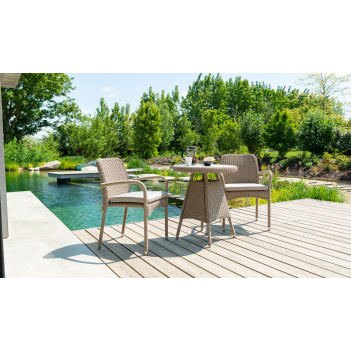 Hazelmere Stacking Armchair to lekkie, sztaplowane krzesło ogrodowe wykonane z trwałej plecionki na aluminiowej ramie, które idealnie sprawdza się w małych i większych aranżacjach zewnętrznych. W zestawie znajduje się 1 krzesło z poduszką w wersji Natural Weave z Dusk (lub Grey Weave z Pistachio). Wymiary: szer. 590 mm × wys. 850 mm × gł. 590 mm, a masa to 5,5 kg — co ułatwia jego przenoszenie i układanie jedno na drugim. Produkty z kolekcji Hazelmere objęte są 3-letnią gwarancją, co potwierdza ich jakość ponadczasowego, rattanowego stylu.