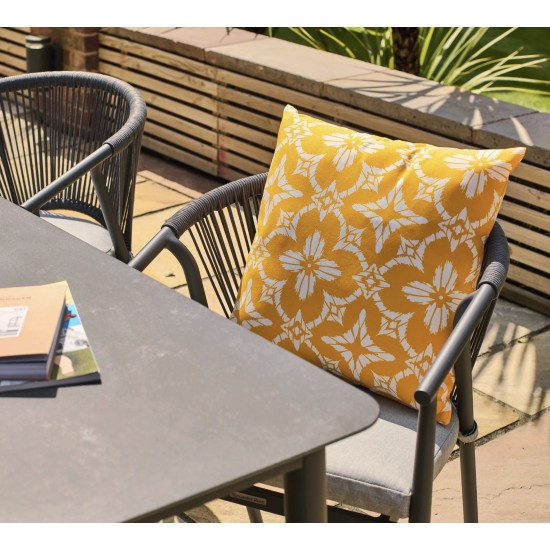 Zestaw jadalniany Kyoto 6-Seat Rectangular Dining Set łączy nowoczesny design z funkcjonalnością, tworząc idealne miejsce do spożywania posiłków, organizowania spotkań towarzyskich lub rodzinnych kolacji na świeżym powietrzu. W jego skład wchodzi prostokątny stół o wymiarach 1800 × 1000 × 750 mm oraz 6 ergonomicznych krzeseł o wymiarach 550 × 550 × 770 mm, które są wyposażone w przyjemne siedziska i plecione detale z liny odpornej na warunki atmosferyczne. Powłoka z ceramicznie nadrukowanego szkła na blacie stołu nadaje całości elegancki, nowoczesny charakter, a jednocześnie ułatwia czyszczenie i konserwację. Solidna rama z aluminium odpornego na rdzę gwarantuje stabilność i długowieczność mebli w różnych warunkach pogodowych. Całość tworzy spójną aranżację, która świetnie sprawdzi się na tarasie, patio czy w ogrodzie, oferując wygodne miejsce dla sześciu osób podczas każdego posiłku na zewnątrz. Gwarancja: 3 lata — to potwierdzenie jakości wykonania i trwałości zestawu.