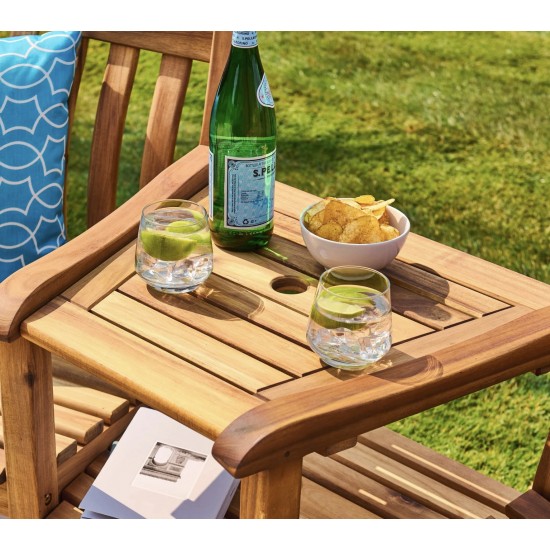 Komplet Redcliffe Acacia Wood Companion Set to wyjątkowo praktyczne i stylowe rozwiązanie dla osób ceniących komfort, trwałość oraz klasyczne wzornictwo mebli ogrodowych. W jego skład wchodzi 1 zestaw dwóch połączonych krzeseł z centralnym stolikiem, który został zaprojektowany z myślą o wspólnych chwilach przy kawie, wieczornym napoju lub po prostu relaksie w zielonej przestrzeni. Centralny stolik posiada otwór na parasol, dzięki któremu można wprowadzić dodatkowy cień w słoneczne dni. Mebel wykonany jest z naturalnego twardego drewna akacjowego, ręcznie szlifowanego i pokrytego oleistym wykończeniem, co wzmacnia jego odporność na warunki atmosferyczne. Jego ciepła, złocisto-brązowa barwa z wyraźnym usłojeniem sprawia, że zestaw ten doskonale komponuje się z otoczeniem ogrodowym, tarasami i balkonami. Dzięki solidnej konstrukcji i wysokiej jakości materiałom zestaw zapewnia długotrwałe użytkowanie, a 3-letnia gwarancja dodatkowo potwierdza jego niezawodność.