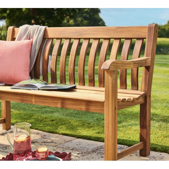 Redcliffe Acacia Wood St. George Bench to tradycyjna, solidna ławka ogrodowa wykonana z wysokiej jakości drewna akacjowego, charakteryzującego się złotobrązowym odcieniem i wyraźnym usłojeniem. W zestawie znajduje się 1 ławka St. George, dostępna w dwóch rozmiarach: 4FT (1230 × 620 × 920 mm) oraz 5FT (1460 × 620 × 920 mm), oba o wadze około 25 kg. Ten mebel z kolekcji Redcliffe jest pokryty gładkim olejowym wykończeniem, które dodatkowo chroni drewno przed warunkami atmosferycznymi. Gwarancja: 3 lata, co potwierdza solidność wykonania i odporność na użytkowanie zewnętrzne.