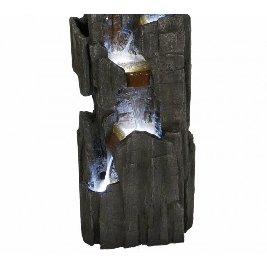 Фонтан изготовлен из высококачественной смолы, устойчивой к погодным условиям, что обеспечивает долговечность. Встроенная LED подсветка подчёркивает движение воды и текстуру поверхности, создавая эффектное освещение в тёмное время суток. Сетевое питание обеспечивает стабильную работу.