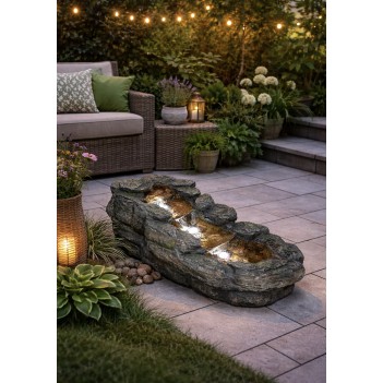 Small Slate River — это декоративный садовый фонтан, вдохновлённый естественным течением каменного ручья. Он создаёт расслабляющую атмосферу благодаря мягкому звуку воды и встроенной LED-подсветке. Компактные размеры L 74 x W 34 x H 24 cm позволяют удобно разместить его на террасе, балконе или в саду. Изготовленный из прочной и устойчивой к погодным условиям смолы, фонтан обеспечивает долговечность использования на открытом воздухе. Вес 8 кг и питание от сети гарантируют стабильную работу и лёгкую установку без сложных подключений.