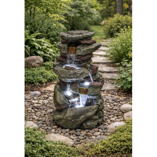 Материал из прочной смолы устойчив к погодным условиям и обеспечивает долговечность. Замкнутая система циркуляции воды и встроенный насос упрощают установку. LED-подсветка подчёркивает поток воды и усиливает декоративный эффект.