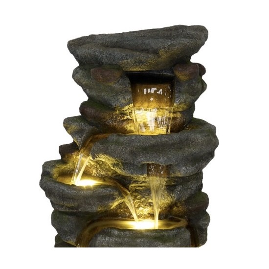 Прочный материал устойчив к погодным условиям и обеспечивает долговечность изделия. Встроенная LED-подсветка подчёркивает поток воды в тёмное время суток, создавая атмосферный эффект. Сетевое питание обеспечивает стабильную работу насоса.
