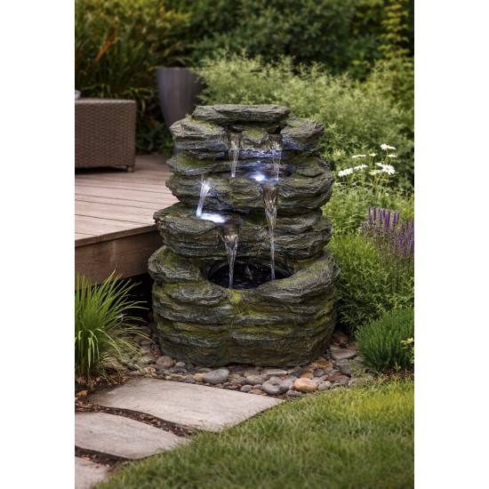 Leith Slate Falls — это компактный садовый фонтан, выполненный в стиле природных сланцевых скал, который создаёт расслабляющую атмосферу в саду, на террасе или во внутреннем дворике. Шестиярусная конструкция обеспечивает естественное движение воды, формируя мягкий звук и визуальный эффект каскада. Изделие изготовлено из прочной смолы, устойчивой к погодным условиям, что делает его идеальным для использования на открытом воздухе. Встроенная LED-подсветка подчёркивает текстуру и движение воды в вечернее время.