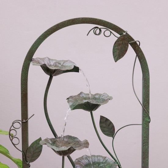 Фонтан Enchanted Arch (120 × 50 × 25 см) изготовлен из прочного цинка в бронзовом оттенке. Декоративная арка с листьями и многоуровневыми лепестками создаёт сказочный образ. Встроенный резервуар и насос 650 л/ч обеспечивают автономную работу от сети. Подходит для установки в саду или на террасе.