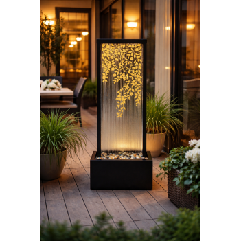 Зеркальная панель отражает окружающее пространство и свет, визуально расширяя небольшие участки и террасы. Художественная гравировка с мотивом лиан добавляет изысканности и подчёркивает современный стиль. Цинковый корпус устойчив к коррозии и подходит для длительного использования на открытом воздухе. Интегрированная система с насосом обеспечивает тихую работу без необходимости подключения к водопроводу. LED освещение подчёркивает движение воды и создаёт расслабляющую атмосферу.