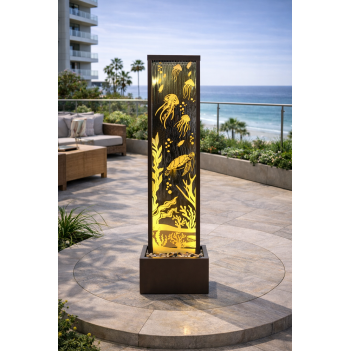 Водная стена Ocean Floor (180 × 48 × 25 см) — современный зеркальный фонтан для сада, террасы или интерьера. Корпус выполнен из прочного цинка коричневого цвета, устойчивого к погодным условиям. Встроенный резервуар (48 × 25 × 20 см) и насос 2000 л/ч обеспечивают автономную работу. Двойная LED-подсветка тёплого белого оттенка подчёркивает плавное течение воды.