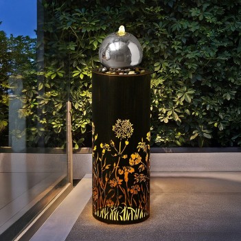Фонтан Wildflower (86 × 28 × 28 см, вес 5,9 кг) выполнен в форме сферы с лазерным узором полевых цветов. Элегантная колонна и шар создают современный силуэт, а встроенная LED-подсветка подчёркивает поток воды вечером. Автономная система упрощает установку в саду или на террасе.