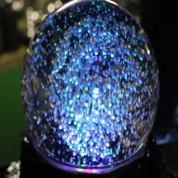 Вода вытекает из-под хрустального шара, освещенного светодиодами, который вращается над отдельно стоящим восточным фонтаном.