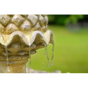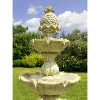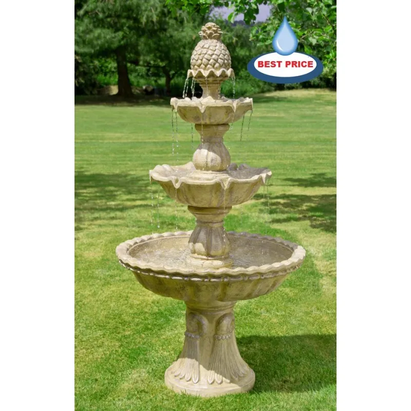 Вода циркулирует из резервуара, спрятанного внутри украшений, к ананасу наверху, где она мягко спускается через последний слой, готовая к перекачиванию вверх и запуску цикла заново.