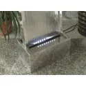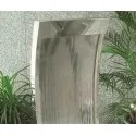 Он имеет вогнутую полированную поверхность и спрятанные вверху форсунки, которые предназначены для равномерного распределения воды. Светодиодная лента расположена у основания фонтана и освещает текущую воду.